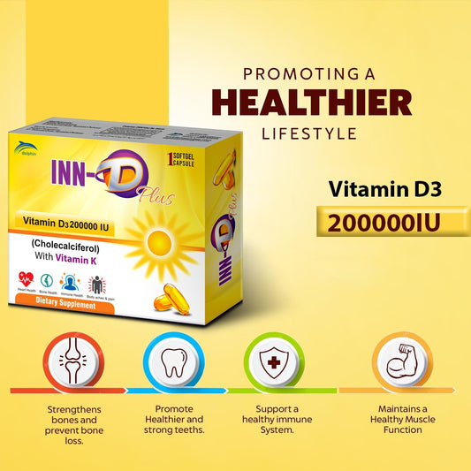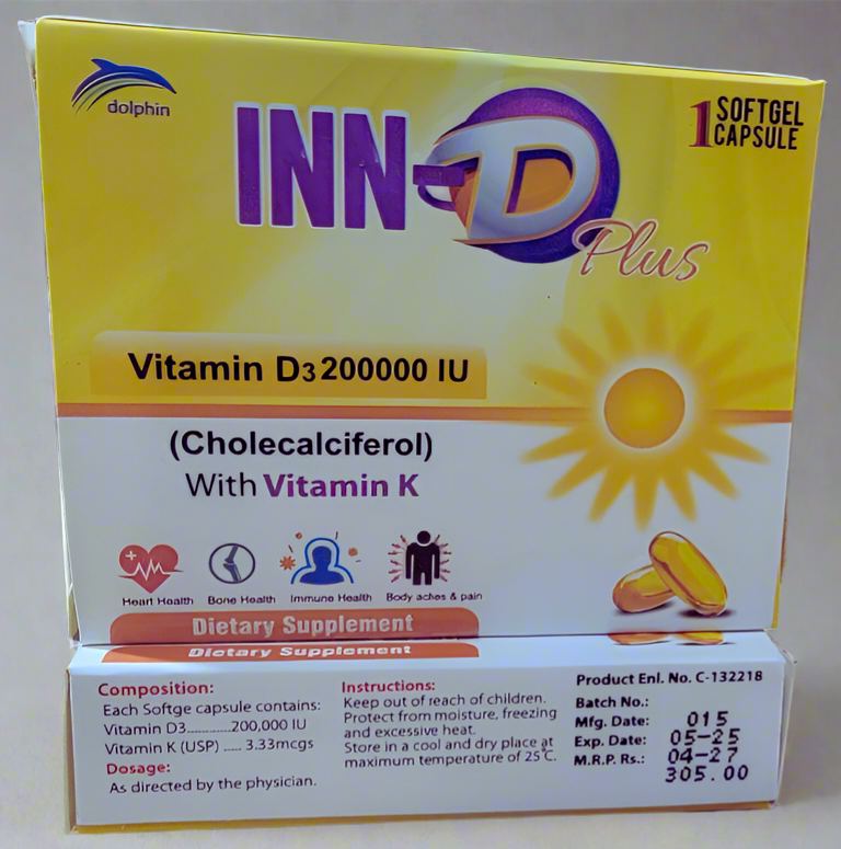 INN-D Plus Softgel Capsule | Vitamin D3 200000 IU with Vitamin K | 1 Softgel | Cholecalciferol Supplement