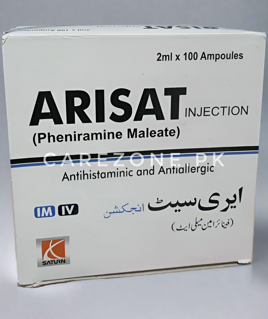 Looking for Arisat Injection (Pheniramine Maleate)? Carezone.pk provides high-quality Arisat 2ml ampoules in packs of 100 for effective allergy relief. Arisat is a trusted antihistaminic and antiallergic solution, manufactured by Saturn, ensuring premium quality. Buy Arisat Injection at unbeatable wholesale prices only at Carezone.pk. Whether for allergies, itching, or motion sickness, Arisat delivers fast and reliable relief. Order Arisat now and experience the best pharmacy rates in Pakistan!