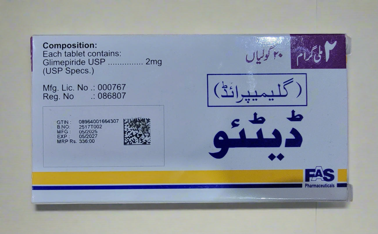 ڈیٹو 2 ملی گرام ٹیبلٹ ذیابطیس ٹائپ 2 کے مریضوں میں شوگر لیول کنٹرول کرنے کے لیے استعمال ہوتی ہے۔