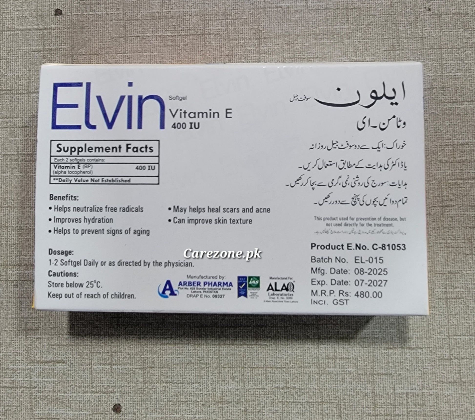 Elvin Vitamin-E 400 IU Softgel Capsules - 20 Softgels - Evion Alternative- Price in Pakistan