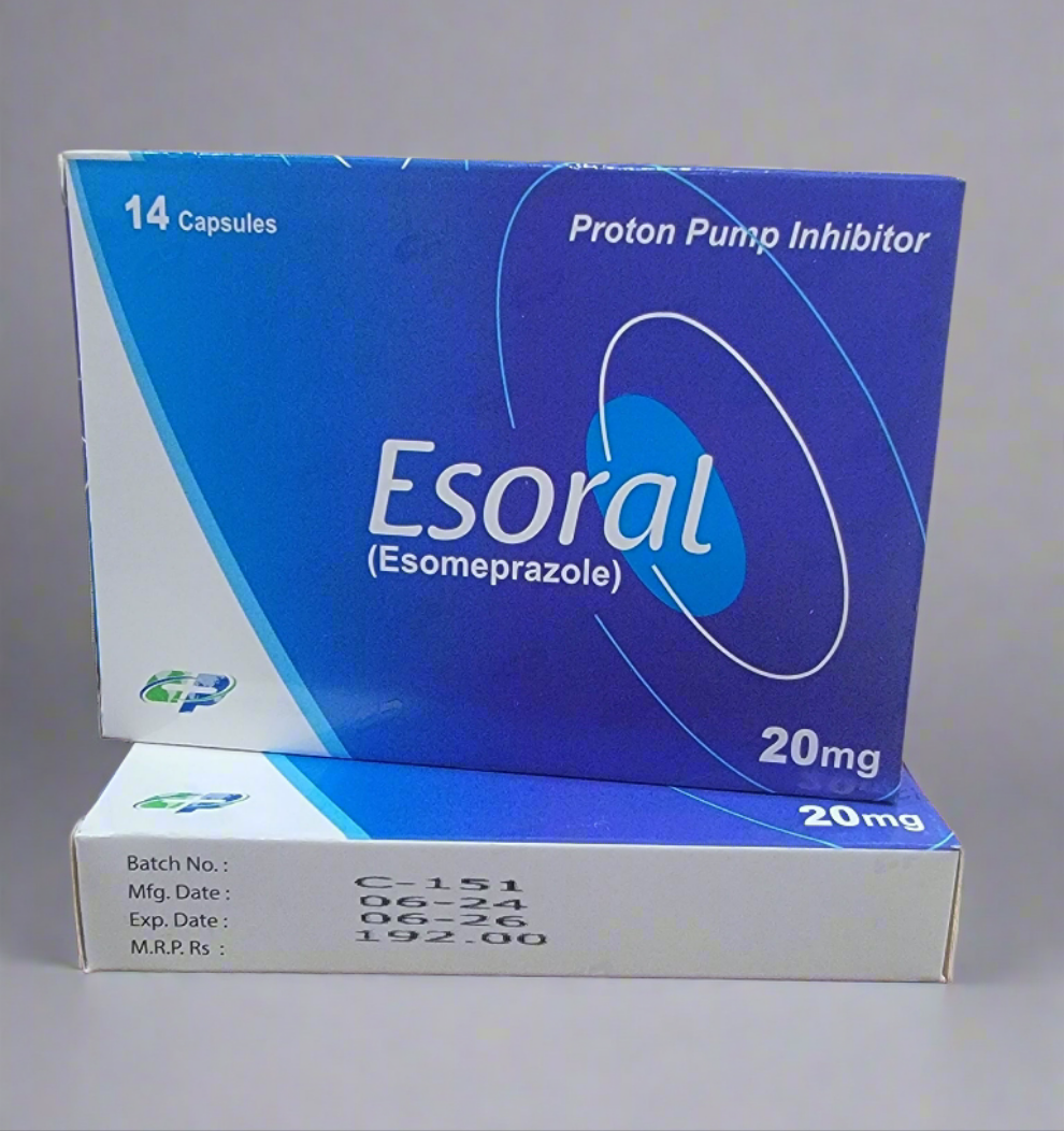 Esoral 20mg Capsules contain Esomeprazole, a proton pump inhibitor (PPI) that reduces stomach acid production. Esoral is commonly used to treat conditions such as gastroesophageal reflux disease (GERD), peptic ulcers, and Zollinger-Ellison syndrome. By decreasing acid production, Esoral helps alleviate symptoms like heartburn, acid reflux, and promotes healing of the esophagus lining.