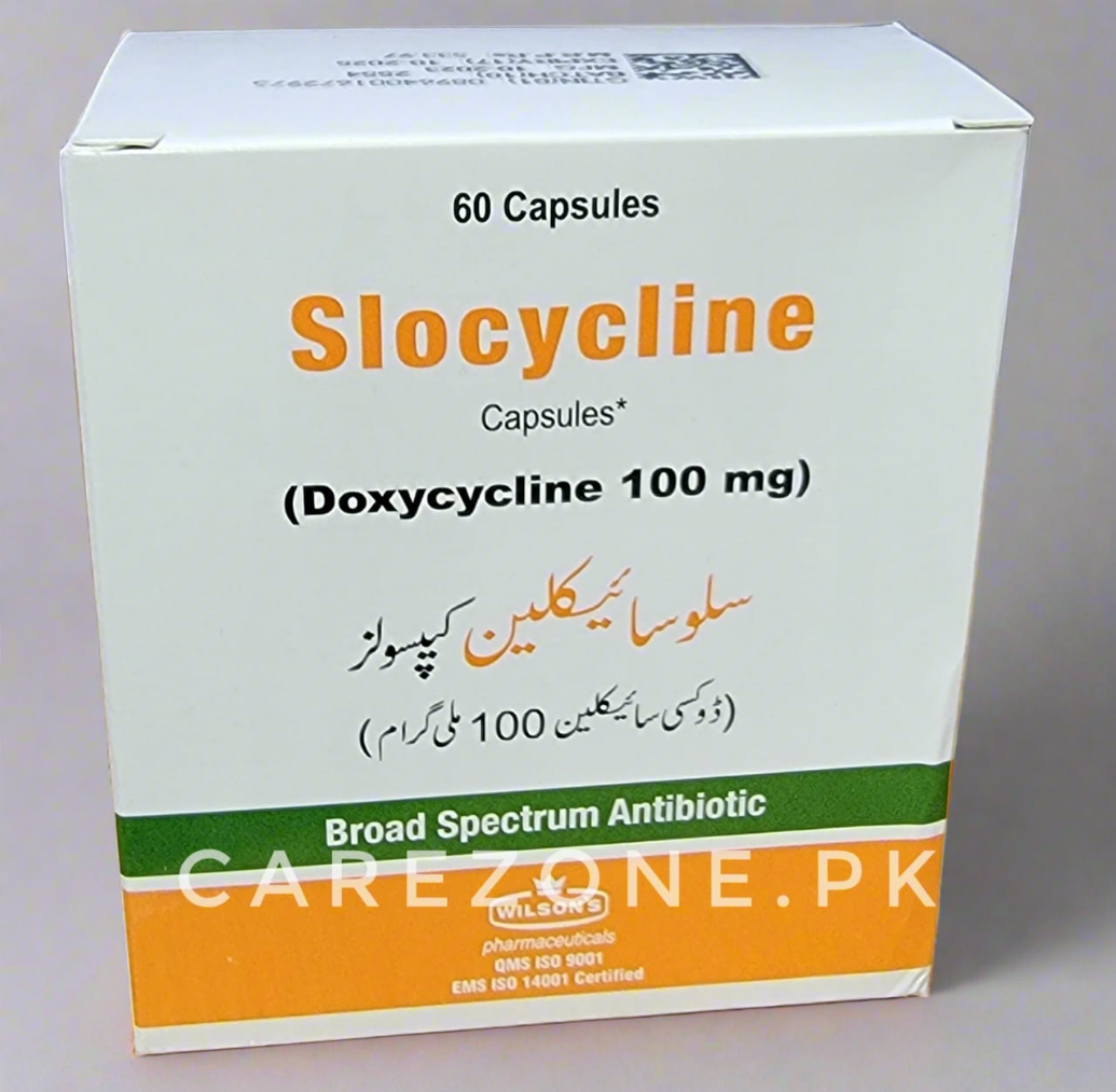 Slocycline (ڈوکسی سائیکلین 100 ملی گرام) ایک وسیع اثر رکھنے والی اینٹی بائیوٹک ہے جو کہ مختلف بیکٹیریل انفیکشنز جیسے سانس کی نالی، پیشاب کی نالی، کیل مہاسے اور جنسی طور پر منتقل ہونے والی بیماریوں کے علاج میں استعمال ہوتی ہے۔ Slocycline کئی اقسام کے بیکٹیریا کے خلاف مؤثر ہے۔
